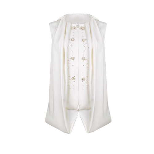 White sleeveless outer with draped front details. The inner panel is embellished with scattered beads, pearls and White crystals, adding an elegant hidden sparkle. Minimalist on the outside, luxurious within.