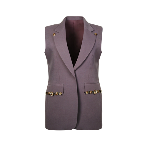 Structured vest crafted in an grey-inspired fabric. Adorned with beaded details and gold-colored crystal dots on both sides and crystals arranged in a firework-like design on pockets, it blends modern sophistication with a timeless touch.