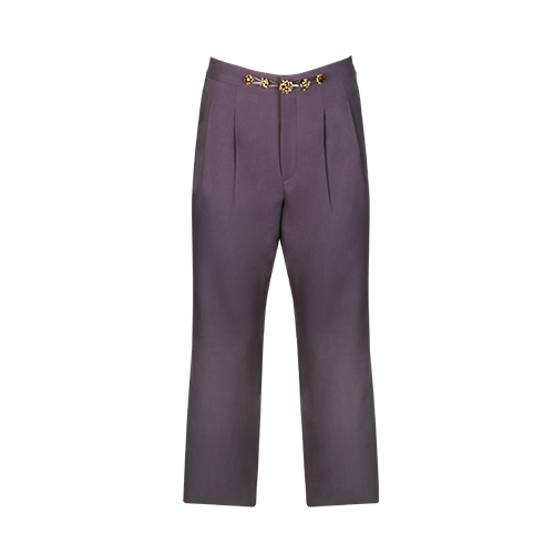 Grey tailored trousers with an elegant straight cut. The waistband is embellished with sparkling crystal gold and bead details, adding a little touch of statement to the minimalist design. Featuring a sleek yet comfortable silhouette.