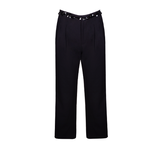 Black tailored trousers with a classic and elegant straight cut. The waistband is adorned with black acrylic pieces, black sand beads, and crystals. A minimalist design elevated with luxurious embellishments, offering a versatile look perfect for both formal and semi-formal occasions.