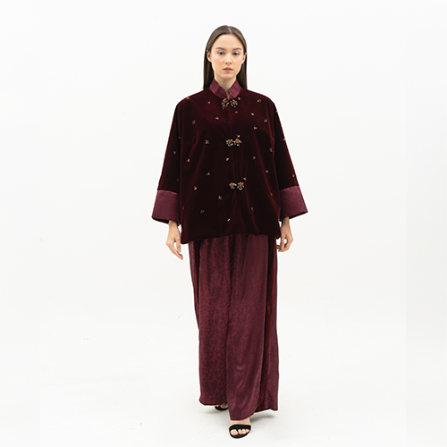 Silk satin pants in burgundy eaturing a subtle floral embossed texture, designed with velvet side stripes for a refined contrast detail. Finished with a floor-length silhouette and elasticated waistband, offering an elegant yet effortless comfort for all-day wear.
