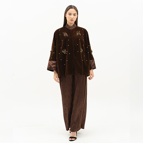 A brown velvet jacket detailed with hand-applied embellishments made from brown-colored laser-cut acrylic, beads, and crystals, creating a refined festive look. Designed with a structured collar and relaxed cut, offering a modern interpretation of traditional elegance.