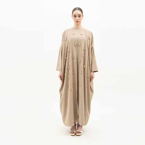This brown abaya, designed in a matching tone with its inner layer, is crafted from a soft and breathable fabric that drapes gracefully along the silhouette. The front is fully adorned from top to hem with white laser-cut acrylic petals, combined with honey crystals and white beads, creating an elegant dimensional texture.