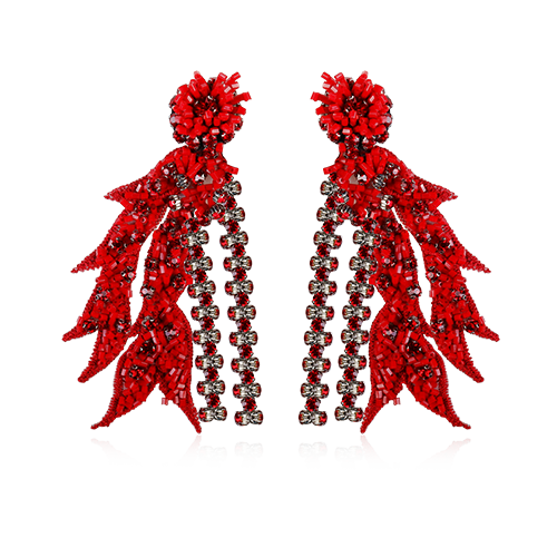 These statement drop earrings feature cascading leaf-like silhouettes, adorned with red crystals and beads set in intricate detail. Their long, swaying design creates an elegant look.