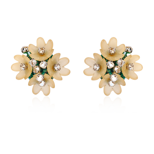 Elegant dot earrings featuring orange laser-cut acrylic petals accented with green and grey crystal embellishments. Designed in a compact floral silhouette and finished with silver-tone stud fastening.