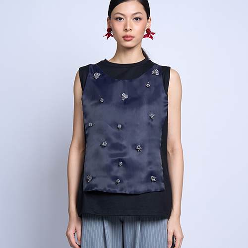 A black top featuring a navy organza front overlay, embellished with clusters of laser-cut purple acrylic petals, sequins, and grey crystals for an elegant decorative touch, presenting a modern-feminine style.