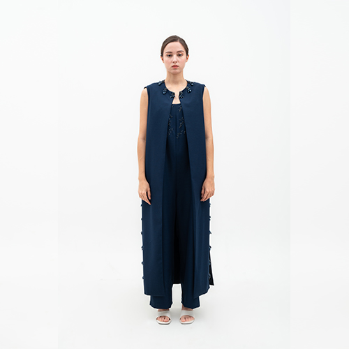 This sleeveless long vest in deep navy is crafted from a comfortable fabric. The front is embellished with fluid navy metallic accents and rows of dangling faux pearls. Its clean, elongated silhouette with a soft shimmering finish makes it a versatile outer layer for a polished, modern look.