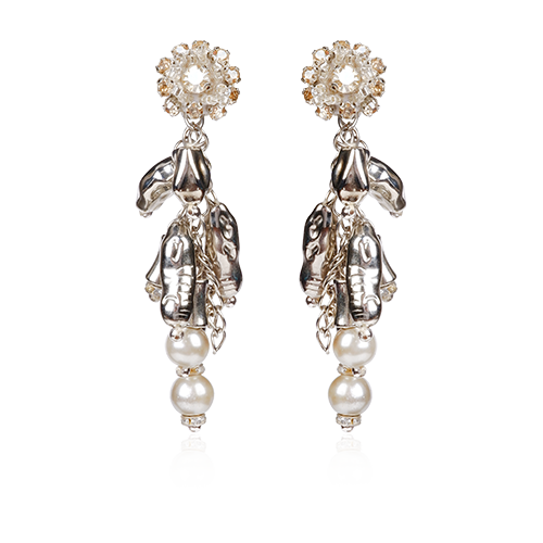 These statement drop earrings feature clustered crystals at the stud, finished with cascading silver-tone irregular metal charms and dangling faux pearls. The playful movement and mix of textures create a chic, modern look.