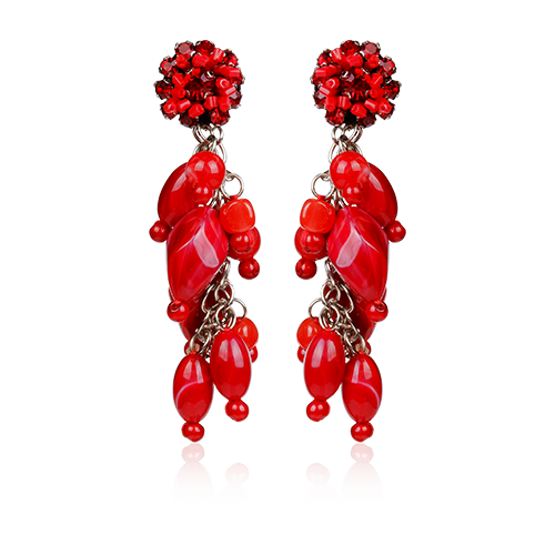 These statement drop earrings feature clustered crystals at the stud, finished with cascading red metal charms and dangling faux pearls. The playful movement and mix of textures create a chic, modern look.