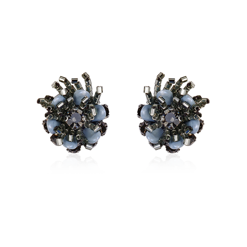 The statement dot earrings are crafted with statement grey-colored laser-cut flower acrylic, adorned with 3D embbelishments of beads and dark grey crsytals.