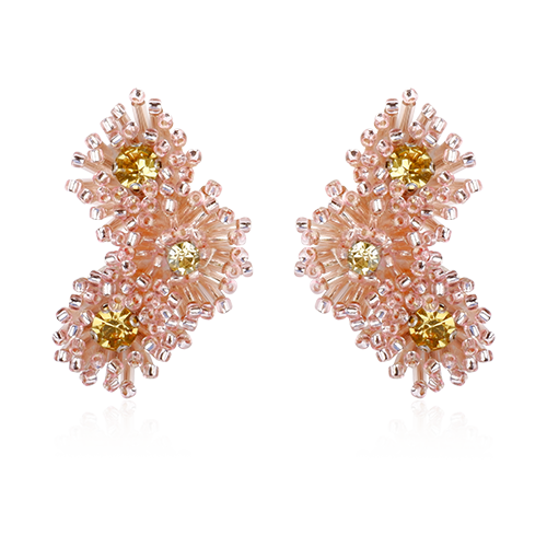 These statement earrings feature clustered beadwork in soft blush tones, accented with yellow crystals that create a subtle floral impression. Perfect to add a warm, feminine touch to any look.