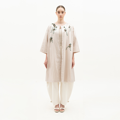 This outer is crafted from structured yet comfortable cotton twill, creating a clean silhouette with a refined finish. The front features abstract embellishments of pink laser-cut acrylic petals, paired with yellow crystals and green beads. Their artistic placement creates a soft yet statement look.